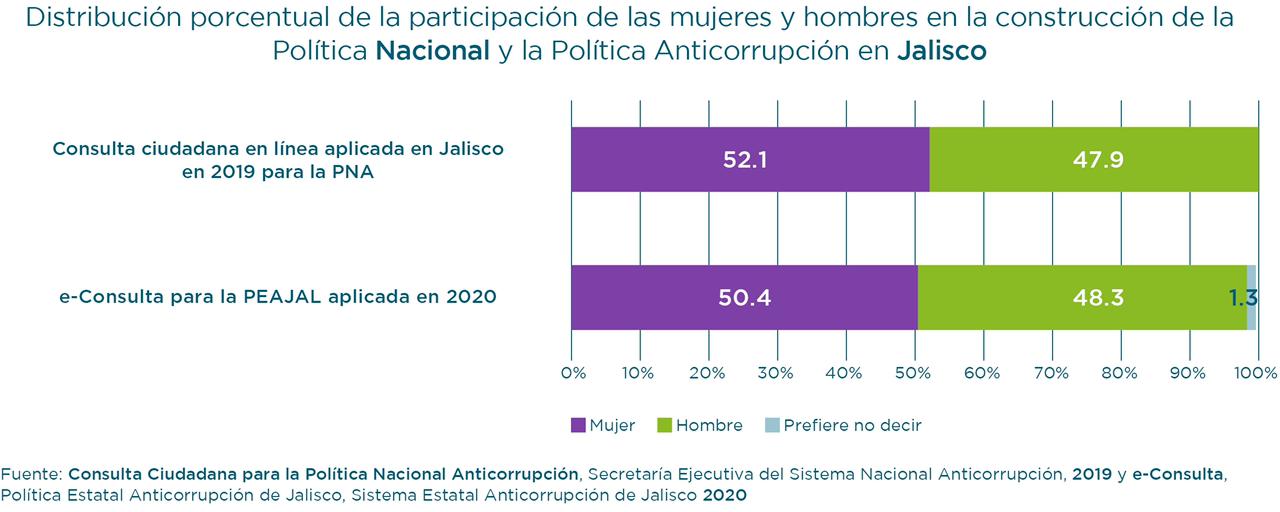 La participación en Jalisco de las mujeres (52.1%) fue mayor que la de los hombres en la Consulta Ciudadana para la formulación de la Política Nacional Anticorrupción. De igual manera, en la e-Consulta que realizó el SEAJAL para la elaboración de la PEAJAL también fue mayoritaria la participación de las mujeres (50.4%).
